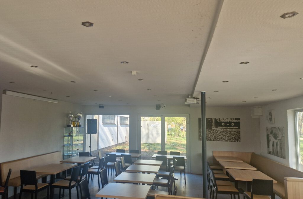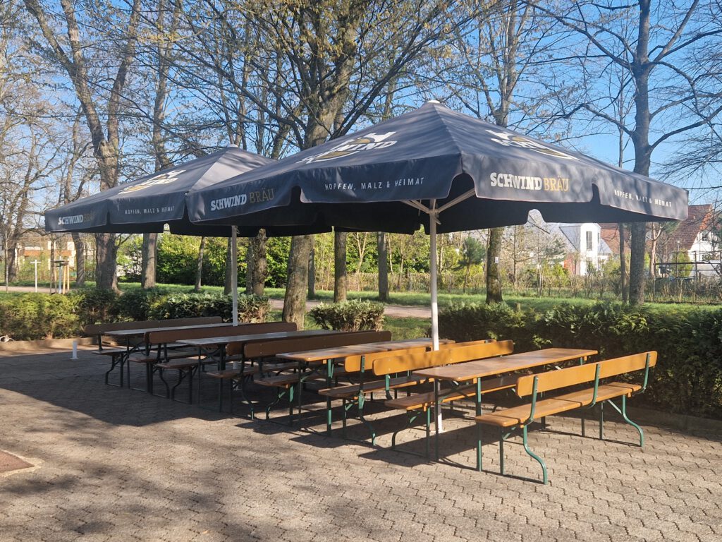 Das Ergebnis kann sich mehr als sehen lassen. Neue, einheitliche Lichter tauchen das aufgeräumte Vereinsheim in ein gemütliches Licht - gerade, wenn es abends einmal später wird. Bequeme Holzgarnituren stehen unter großen SCHWIND-Sonnenschirmen auf der gesäuberten Terrasse und laden zum Verweilen und zum Austausch ein. Für Feierlichkeiten sind zwei Disco-Lichter montiert, so dass Siege und Erfolge ab sofort auch wieder gebührend am eigenen Gelände gefeiert werden können.