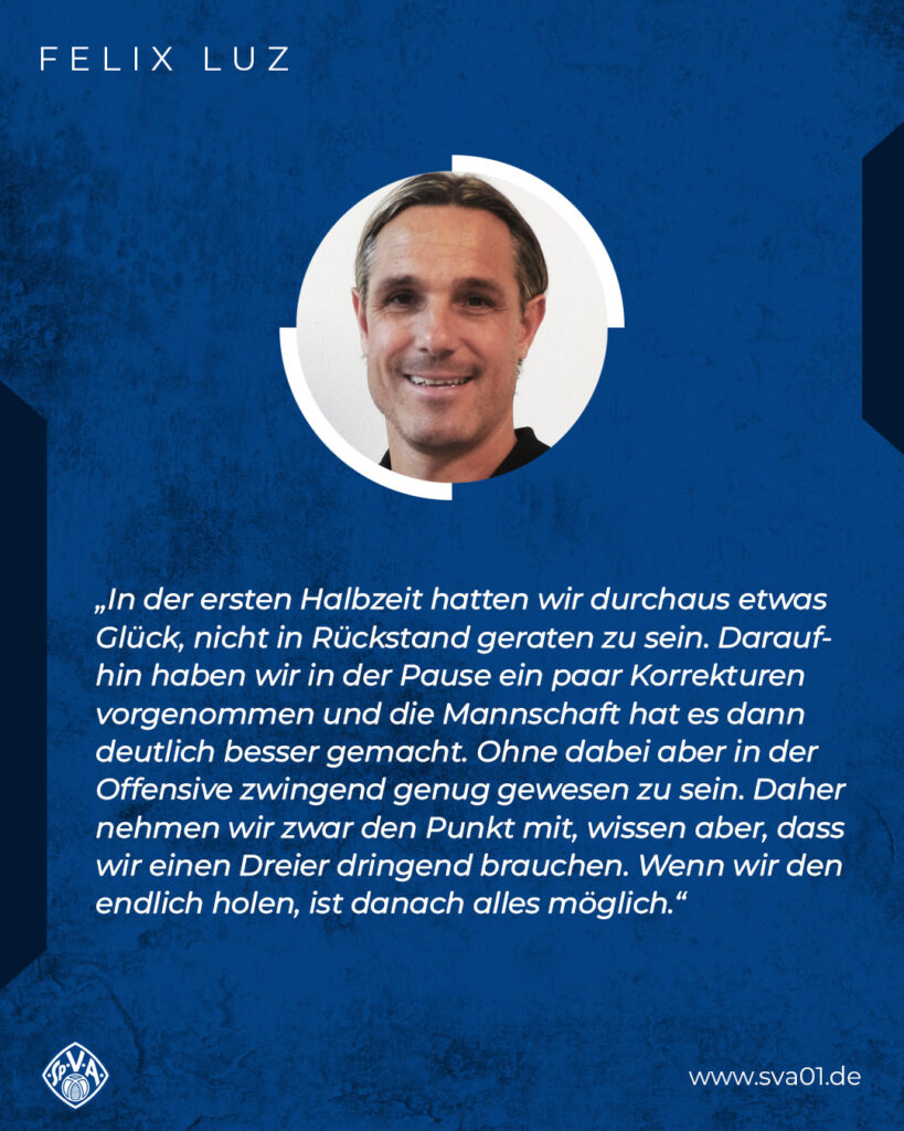 Cheftrainer Felix Luz verzichtete auf personelle Veränderungen in der Halbzeitpause genauso wie sein Gegenüber Matthias Günes. In der ersten Viertelstunde des zweiten Durchgangs blieben Torraumszenen zunächst Mangelware, lediglich ein Abschluss von Philipp Kirsamer landete aus knapp zwanzig Metern weit über dem Tor der Viktoria (53.). Die Jungs vom Schönbusch behielten in den zweiten 45 Minuten deutlich besser die Ordnung bei und ließen somit weniger Aktionen der Gastgeber zu. Folglich versuchte es der FCM mit Distanzschüssen, doch auch der Abschluss des eingewechselten Luan Fusaro strich am langen Pfosten vorbei (66.). Beide Teams egalisierten sich zunehmend im Mittelfeld und keiner wollte mehr den entscheidenden Fehler in der Partie machen. In den letzten Minuten vor dem Abpfiff überlegten es sich die Mannschaften dann aber doch nochmal anders und die Zuschauer sahen noch Chancen auf beiden Seiten. Auf der einen konnte Memmingens David Bauer SVA-Keeper Eric Verstappen nicht mit einem Kopfball überwinden, den schnell eingeleiteten Konter hingegen der eingewechselte Nino Cassaniti nicht für den SVA nutzen. Somit wurde es zwar kein Dreifach-Punktgewinn für die Mannschaft von Cheftrainer Felix Luz, aber der erste seit dem 25.10.2025.