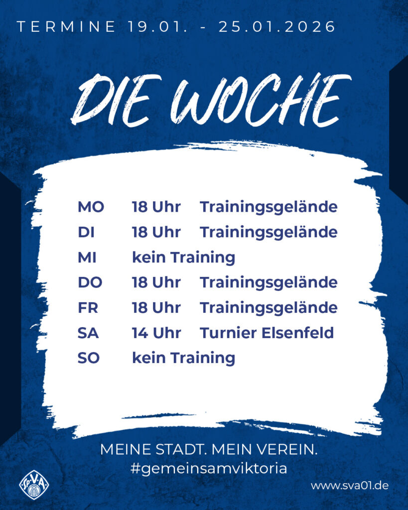 So trainieren unsere Jungs in der ersten kompletten Woche der Wintervorbereitung. Die Einheiten finden am Trainingsgelände des SVA in der Kleinen Schönbuschallee 92 statt (außer bei witterungsbedingten Änderungen).