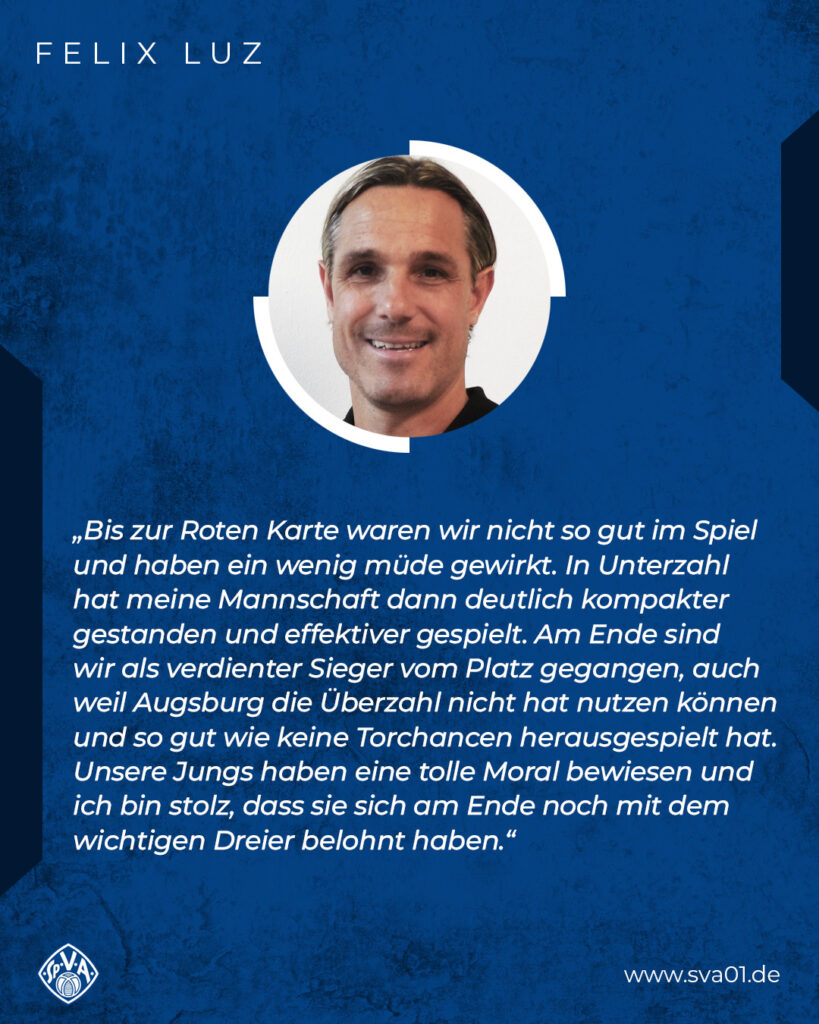 Beide Mannschaften gingen ohne personelle Veränderungen in den zweiten Durchgang und die Viktoria war zunächst darum bemüht, in Unterzahl eine stabile Defensive auf den Platz zu bringen. Dafür agierte man ab sofort in einem kompakten 4-4-1-System. Da dieses Vorhaben gut umgesetzt wurde, kamen die Gastgeber erst einmal nicht zu gelungenen Offensivaktionen. Nach einer guten Stunde mündete ein offensiver Vorstoß des SVA in einer Ecke. Diese landete von Henry Held ausgeführt auf dem Kopf von Kapitän Beni Baier, dessen Kopfballaufsetzer aber auch wieder nur die Latte traf. Den Abpraller versuchte Niklas Borger im Getümmel über die Linie zu befördern, aber auch das klappte nicht (60.). Welch Pech für die Viktorianer, dass zum zweiten Mal an diesem Nachmittag das Aluminium in der Rosenau wackelte statt dass man endlich ein Tor bejubeln durfte. Doch das sollte noch kommen. Acht Minuten später war Nino Cassaniti - wie schon in anderen Partien - nur durch ein Foulspiel im gegnerischen Sechzehner vom Ball zu trennen. Schiedsrichter Kenny Abieba zögerte nicht und zeigte direkt auf den Elfmeterpunkt. Diese Chance ließ sich SVA-Kapitän Beni Baier nicht entgehen und verwandelte sicher zur 1:0-Führung aus Sicht der Viktorianer (68.). Was für eine Willensleistung der Luz-Elf, die in Unterzahl nicht nur diszipliniert verteidigte, sondern eben auch den wichtigen Dreier im Abstiegskampf erzwingen wollte. Die Hausherren ihrerseits nutzen alle Wechselmöglichkeiten aus und wollten unbedingt wenigstens noch den Ausgleich erzielen. Der SVA hielt aber dagegen, warf sich in jeden Schuss und jeden Zweikampf. In der Nachspielzeit hatte Henry Held dann sogar noch das 2:0 auf dem Fuß, doch der Abschluss ging über das Gehäuse der Fuggerstädter. Es blieb aber beim verdienten Auswärtsdreier für den SVA, der damit wichtige drei Zähler im Kampf um den Klassenerhalt einsammeln konnte.