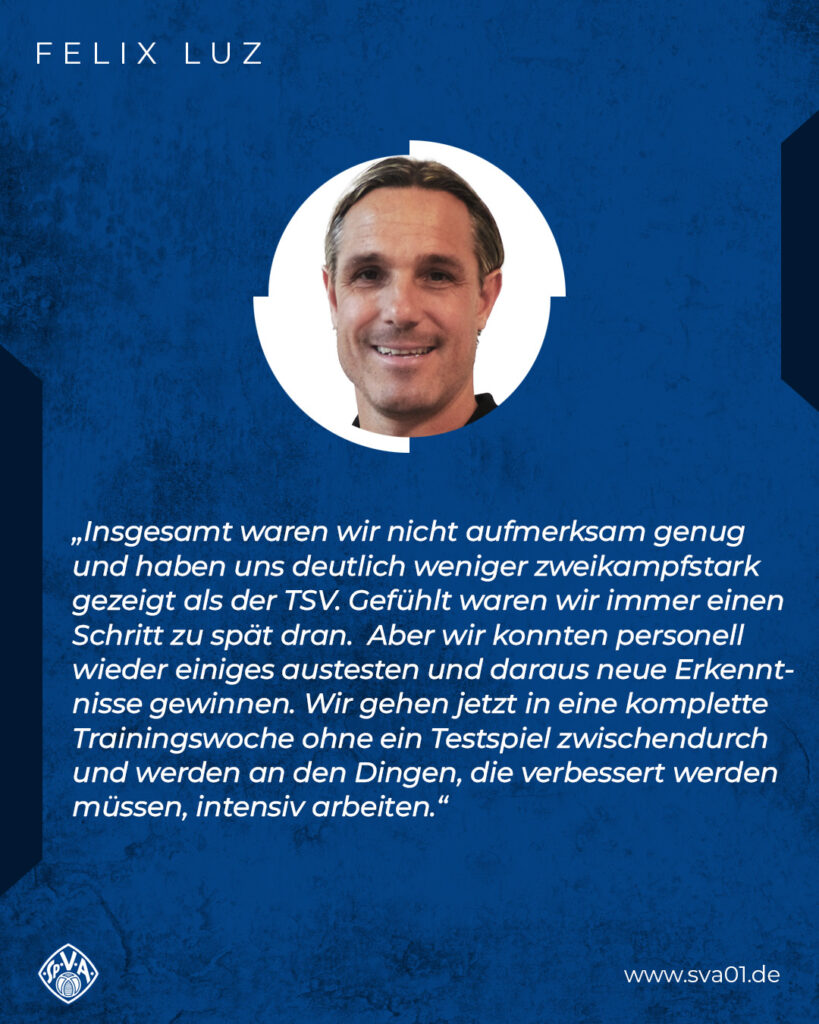 In den ersten 20 Minuten kamen die Viktorianer zu einem Abschluss von Beni Baier (zu zentral) und zu einer guten Gelegenheit durch Hale Lombard und Konstantin Push, Letztgenannter rutschte aber frei vor dem Tor am Ball vorbei. Die Gastgeber präsentierten sich hellwach und speziell Dennis de Sousa Oelsner, Sean Horozovic und Abdellatif el Mahaoui brachten die SVA-Defensivreihe ein ums andere Mal in Bedrängnis. So war es dann auch el Mahaoui, der nach einer halben Stunde den Spielstand mit einem Doppelpack innerhalb von fünf Minuten auf 2:0 aus Sicht des TSV stellte. Kurz vor der Halbzeit dann die wohl beste Aktion des SVA: Benjamin Baier brachte einen direkten Freistoß klasse auf das TSV-Gehäuse, Keeper Jan Schulz wehrte den Ball aber stark ab (45.).