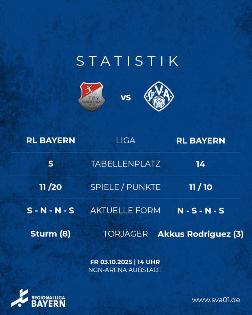 Am zwölften Spieltag müssen die Weiß-Blauen bei einer Mannschaft antreten, die als Tabellenfünfter einen durchweg guten Start in die neue Spielzeit hingelegt hat. Und zwar im Ligabetrieb als auch im Pokalwettbewerb, wo die Mannschaft aus dem Landkreis Rhön-Grabfeld wie der SVA auch im Viertelfinale steht und dort auf Drittligist TSV 1860 München trifft. „Ein Drittel der Saison ist gespielt und man sieht klare Tendenzen, was gut läuft und was noch verbessert werden sollte. Nun bricht der Herbst an und wir wollen diesen nutzen, um weiter Punkte sammeln und dann gut in die Winterpause gehen zu können. Aubstadt ist als Tabellenfünfter in einem Auswärtsspiel natürlich keine leichte Aufgabe, wir sind aber optimistisch und wollen unseren positiven Trend fortsetzen“, blickt SVA-Cheftrainer Aytac Sulu auf die Ausgangslage.