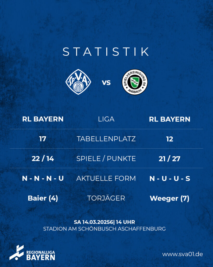 Die Bilanz zwischen beiden Vereinen spricht für die heutigen Gäste. In bisher sieben Aufeinandertreffen in der Regionalliga Bayern konnten die Weiß-Blauen erst einen Sieg feiern. Dieser fiel allerdings deutlich aus: 4:1 stand es am Ende im November 2024 im Stadion am Schönbusch. Zwei Mal trennte man sich mit einem Unentschieden, in vier Begegnungen hieß der Sieger Ansbach 09.