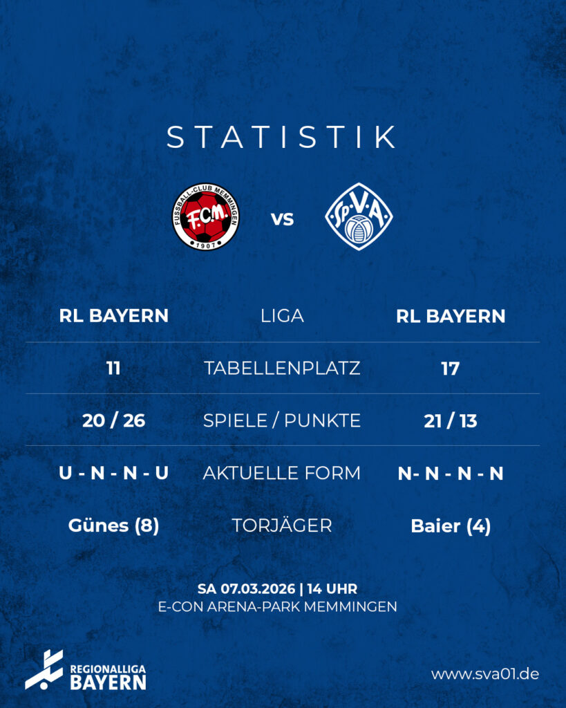 Die Mannschaft aus dem Allgäu präsentierte sich vom Saisonstart bis zur Winterpause weitestgehend stark und überwinterte auf Tabellenplatz 11 mit zehn Punkten Vorsprung auf den ersten Relegationsrang. Am vergangenen Wochenende gelang der Mannschaft von Trainer Matthias Günes ein ordentlicher Saison-Restart mit einem Unentschieden (2:2) beim FV Illertissen. „Die Ausgangslage ist klar. Wir stehen auf einem direkten Abstiegsplatz und brauchen dringend ein Erfolgserlebnis, das wir durch das Abstellen unserer leichten Fehler auch erreichen können", gibt SVA-Cheftrainer Felix Luz einen Einblick in seine Erwartungshaltung.
